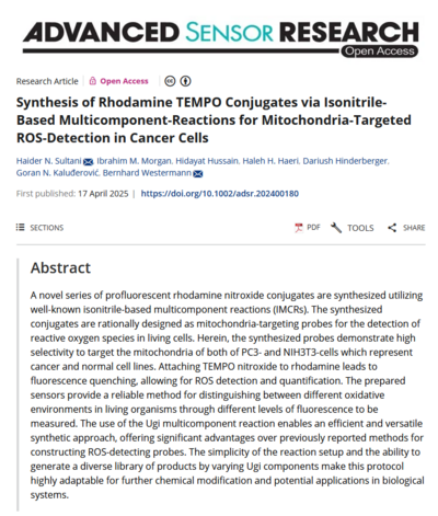 IPB chemists and their partners at Martin-Luther University Halle-Wittenberg (MLU) and the Merseburg University of Applied Sciences produced a series of profluorescent rhodamine-nitroxide conjugates using an isonitrile-based multicomponent reaction. These synthesized compounds can be used as mitochondria-specific probes to detect reactive oxygen species (ROS) in living cells. Excessive ROS formation causes cell damage, leading to oxidative stress and cell death. Cancer cells, in particular, are characterized by increased ROS production due to their high metabolic activity. Approximately 90 percent of the ROS formed in cancer cells originate from the mitochondria. Therefore, the probe designed by the Halle chemists is particularly suitable for detecting cancer cells.