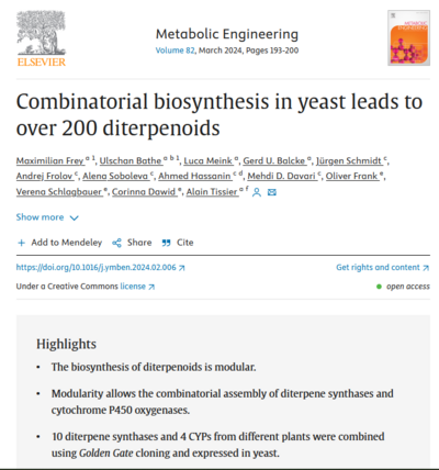IPB scientists have recently generated a substantial library of diterpenoids by combinatorial biosynthesis. In a Golden Gate-based approach, they combined the catalytic activities of ten different diterpene synthases with four cytochrome P450 oxygenases from different plant species. The expression of all possible combinations in individual yeast strains led to the production of more than 200 diterpenoids, of which 36 compounds were already known and 13 were fully structurally elucidated.