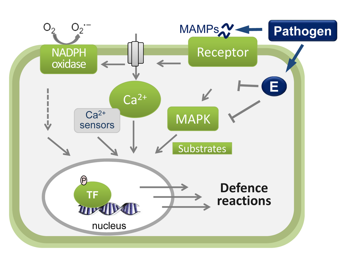 Plants are constantly surrounded by microbes and possess precise mechanisms to mount resistance strategies when needed but also prevent unnecessary energy-consuming defense activation. Detection of microbes is mediated by plant surveillance systems, which is ultimately channelled into appropriate immune responses through intracellular signal transduction networks. Upon receptor-mediated recognition of microbe-associated molecular patterns (MAMPs), ion fluxes across the plasma membrane are immediately induced. This is tightly linked to an increase in cytoplasmic calcium levels (which is perceived by calcium sensing proteins) and accompanied by activation of protein kinases (e.g. CDPKs/calcium-dependent protein kinases and MAPKs/mitogen-activated protein kinases), reactive oxygen species production, and ultimately expression of defense genes as well as accumulation of defense molecules. The temporally and spatially fine-tuned defense response calls for an integrative coordination of all these subsets of signaling events. Pathogens, on the other hand, have evolved effectors (E) that subvert plant signaling and interfere with immunity-related defense. Using model plant systems such as Arabidopsis thaliana, our research aims to unravel the early plant cellular signaling network and the interplay with pathogen effectors.