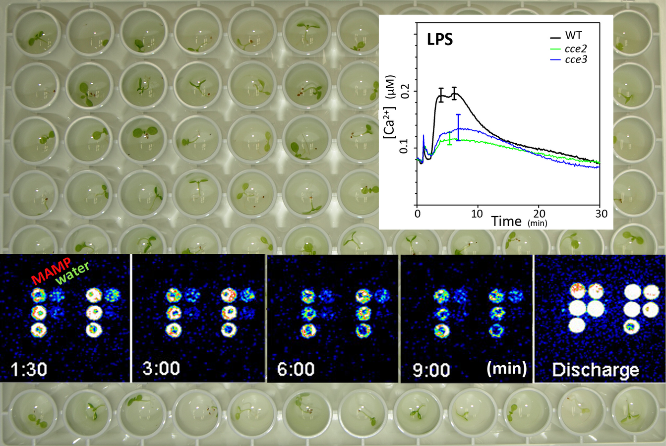 Fig. 1: MAMP-induced changes in cytosolic [Ca2+] can be visualized as heightened luminescence in Arabidopsis plants expressing the Ca2+ reporter, apoaequorin. This microplate-based assay is highly amenable for high throughput genetic mutant screens. Inserted graph shows the Ca2+ response to bacterial lipopolysaccharide (LPS) in two “changed calcium elevation” (cce) mutants.