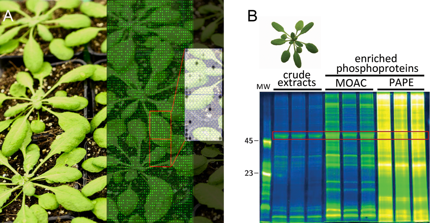 Fig. 2: Examples of methods used for identifying MAPK targets: (A) An Arabidopsis protein array used for in vitro screening of MAPK substrates (Image superimposed on Arabidopsis plants). (B) Phosphoprotein-staining (ProQ Diamond) gel comparing phosphoproteins enriched using classical MOAC (Metal-Oxide-Affinity Chromatography) and the improved PAPE (Prefractionation-Assisted Phosphoprotein Enrichment) method (Lassowskat et al., 2013).