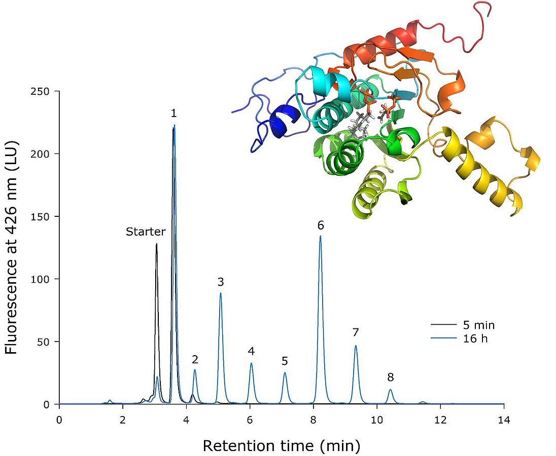 The isoprenoids with terpenoids, steroids and polyisoprenes form a group of complex natural products which are biosynthesized from simple precursors, the isoprenyl diphosphates. The interest of our group is enzyme-mediated prenylation, which transforms natural but also synthetic isoprenyl diphosphates into terpenes (e.g. fragrants found in essential oils) by cyclization (terpene cyclases) or into rubber precursors by chain elongation (cis-prenyltransferases, see Figure). Furthermore, we focus on the transfer of isoprenyl moieties to phenolics (aromatic prenyltransferases). The identification and biocatalytic application of such enzymes (see methodology ) is complemented by the desire to understand the mechanisms of biological catalysis by computational methods, use of enzyme variants (mutations) (with PGs “Modeling” and “Phenylpropanoids ”), and indicator substrates (with AGs Bioactives and Biofunctional Synthesis).