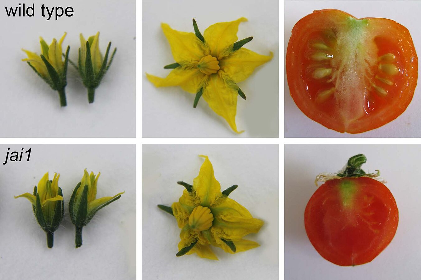 As known from mutants defective in JA perception, jasmonates are important for the proper development of reproductive organs. In contrast to the JA-insensitive mutant of Arabidopsis thaliana showing a male-sterile phenotype, the JA-insensitive tomato mutant Sljai1 is female sterile and does not develop seeds. It shows, however, additional alterations in the development of male flower organs: Sljai1 exhibits disturbed pollen development...