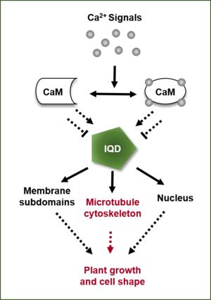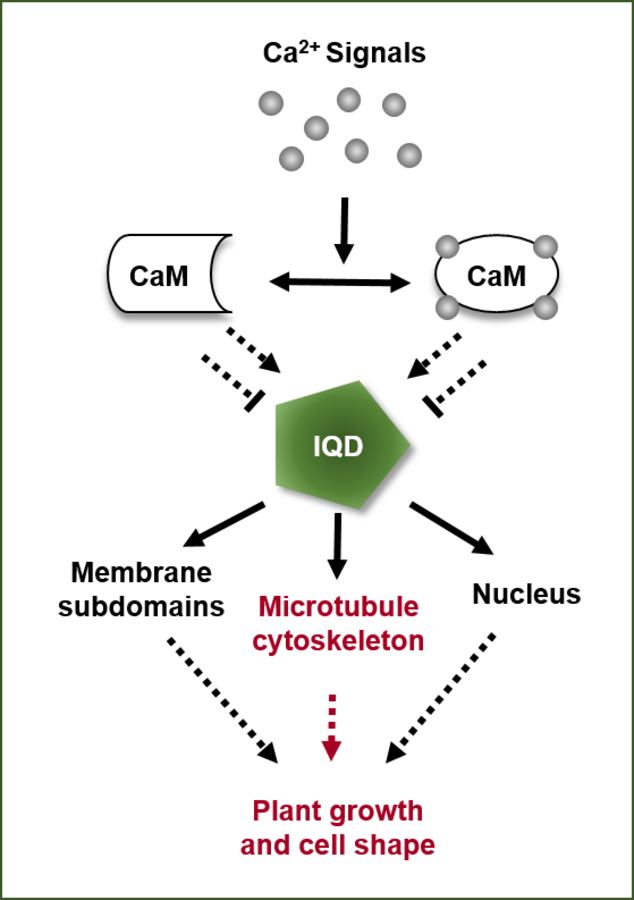 Signaling via the second messenger calcium plays a prominent role in plants for coordinating numerous developmental processes and responses to environmental cues. Generation of stimulus-specific calcium signatures, decoding of the encrypted information, and mounting specific cellular responses are integral phases of the transduction process, with differential interactions between calcium sensor proteins, such as calmodulin (CaM) and closely related CaM-like proteins (CML), and their molecular targets at its nexus. We previously identified a novel class of CaM/CML target proteins in Arabidopsis, the 33-member IQD (IQ67-DOMAIN) family of largely unknown functions. The plant-specific IQD family represents one of the largest classes of putative CaM/CML targets. Molecular, biochemical and histochemical analysis of the entire Arabidopsis IQD family indicate that IQDs provide an assortment of scaffold proteins at microtubules, the plasma membrane and in the nucleus that regulate plant growth and development. Very little is known in plants about molecular mechanisms of IQD protein function and the underlying biological roles. Our studies of the IQD family thus provide a unique opportunity to address how early signaling is integrated at the cell wall-plasma membrane-cytoskeleton continuum during growth regulation.
