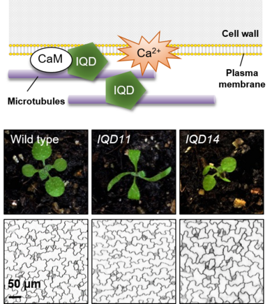 To investigate the biological function of IQDs and members of the interacting KLCR family, we are generating a platform of IQD and KLCR family resources using reverse genetics. Phenotypes observed in IQD gain-of-function alleles point to the involvement of IQD proteins in regulation of microtubule organization and various processes related to plant development (Bürstenbinder et al., 2017). Analysis of PromoterIQD:GFP-GUS lines in terms of spatio-temporal expression domains revealed preferential promoter activities of most IQD family members in actively dividing and/or expanding tissues (Bürstenbinder et al., 2017; Mitra et al., 2019). Informed by the expression analysis, we screened Arabidopsis iqd loss-of-function lines for phenotypes in tissues with endogenous IQD expression. First available data from analysis of knockout lines link IQD function to regulation of microtubule organization and cellulose deposition during morphogenesis of leaf epidermis pavement cells (Mitra et al., 2019). Current projects extend the phenotypic characterization of iqd and klcr knock out lines by molecular and cell biological as well as physiological analyses. Central aspects of interest are: