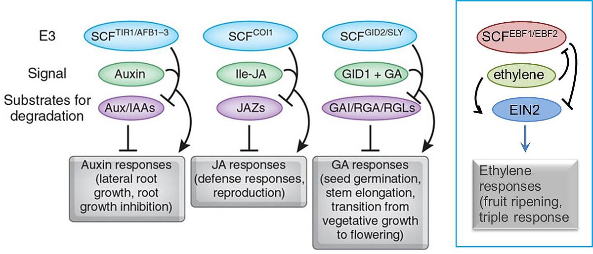 Groundbreaking findings constitute the basis for the Signal Integration Group as SKP1/CDC53/F-Box protein, (SCF)-type E3 complexes, SCFTIR1/AFB1-5 and their degradation targets, the short-lived AUX/IAA transcriptional repressors, were shown to form an auxin co-receptor system. Thus, distinct TIR1/AFB-AUX/IAA co-receptor pairs are differentially perceptive to auxin and constitute various auxin sensors in vivo (Tan, X. et al. Nature 2007, Calderón Villalobos, L.I.A., et al. Nat Chem Biol 2012). The evidence that SCFs consolidate protein degradation, small molecule perception, and cofactor regulation suggests they act as SIGNAL INTEGRATORS essential for growth and development of plants.