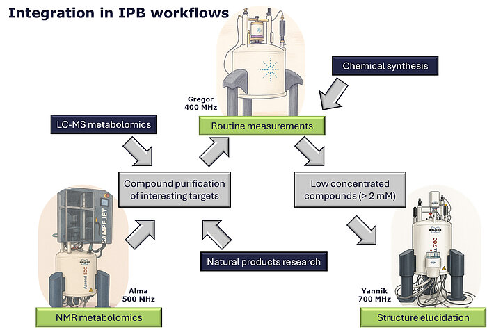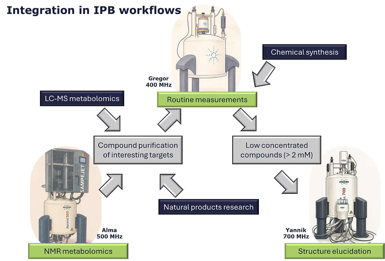 The Analytical Laboratory is part of the Metabolomics Facility and primarily functions as a service unit for the entire IPB. It assists in isolating and chemically characterizing relevant metabolites to verify preliminary annotations and determine the structures of new metabolites, with a strong emphasis on NMR spectroscopy. Additionally, the structure elucidation is also supported by various optical spectroscopic methods (IR, UV, alpha, CD). Furthermore, this research unit is associated with a repository of reference compounds derived from plant and fungal metabolites and their derivatives collected in the institute.