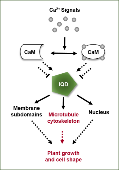 Eine wichtige Rolle in der Koordinierung zahlreicher pflanzlicher Entwicklungsprozesse und Anpassungsreaktionen auf Umweltveränderungen spielen Signale, die über den sekundären Botenstoff Kalzium vermittelt werden. Die Stimulus-spezifische Generierung von Kalziumsignaturen, die Entschlüsselung der darin enthaltenen Informationen und die Umsetzung dieser in zelluläre Prozesse sind integrale Bestandteile der Kalziumsignalumwandlung. Hierbei sind die differenziellen Wechselwirkungen zwischen Kalzium-Sensorproteinen, wie z.B. Calmodulin (CaM) oder CaM-ähnlichen Polypeptiden (CML), und ihren molekularen Interaktionspartnern von besonderer Bedeutung. Wir haben eine neue Klasse von CaM/CML Zielproteinen in Arabidopsis identifiziert, die als IQD (IQ67-DOMAIN) Proteinfamilie (33 Mitglieder) charakterisiert wurde. IQD-Proteine sind auf Pflanzen beschränkt und repräsentieren die bisher größte Gruppe von CaM/CML-bindenden Zielproteinen mit größtenteils unbekannten Funktionen. Molekulare, biochemische und zellbiologische Untersuchungen an IQD-Proteinen zeigen, dass IQD-Proteine vermutlich als Gerüstproteine an Mikrotubuli, der Plasmamembran und im Zellkern fungieren und Wachstum und Entwicklung von Pflanzen regulieren. Da nur sehr wenig über die molekularen Mechanismen von IQD-Funktionen und über die damit im Zusammenhang stehenden biologischen Prozesse in Pflanzen bekannt ist, bilden unsere Untersuchungen zur gesamten Arabidopsis-IQD-Familie eine sehr gute Ausgangsbasis, um zu verstehen, wie frühe Signale auf zellulärer Ebene integriert werden, um Wachstum am Zellwand-Plasmamembran-Zytoskelett-Kontinuum zu kontrollieren.