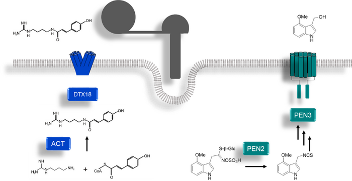 Wir konnten auf diese Weise einen MATE-Transporter aus Arabidopsis identifizieren, der für den Export spezifischer, Sporenkeimungs-inhibierender Hydroxyzimtsäure-Amide (HCAA) verantwortlich ist (Abb. 2). Der Transfer zweier Gene für die Biosynthese (ACT) und den Transport (DTX18) aus Arabidopsis in Kartoffelpflanzen führt zu hohen Mengen an HCAA auf der Blattoberfläche. Dies korreliert mit einer erhöhten Abwehr gegen Infektionen mit P. infestans, was die Bedeutung von antimikrobiellen Oberflächenmetaboliten für die erfolgreiche Pathogenabwehr zeigt (Dobritzsch et al., 2016).