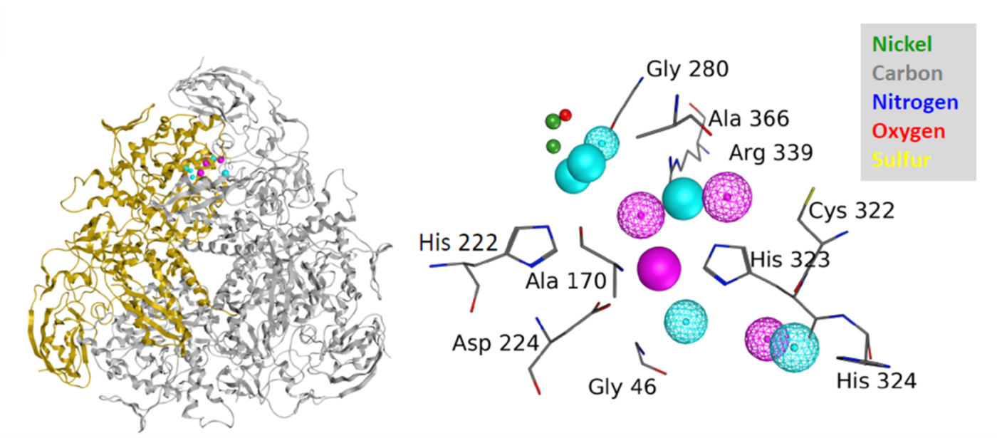 Ziel dieses Teilprojektes (für alle Projekte s. http://www.aip.uni-halle.de/projekte) ist es, Strukturen für Urease- und Nitrifikationsinhibitoren zu identifizieren oder gegebenenfalls neu zu entwerfen und nach ersten Biotests zu optimieren. Die Inhibitoren sollen nicht nur hochwirksam sein, sondern auch günstige Eigenschaften hinsichtlich Anwendung im Feld, Stabilität, Toxikologie und Abbaubarkeit aufweisen. Ein weiteres Ziel war die Suche nach adressierbaren (drugable) Targets im N-Stoffwechsel der Pflanzen, um deren Stickstoff-Effizienz zu verbessern. Konkret wurde ein Modell der Urease-Bindungsstelle erstellt, ein geeignetes Pharmakophor generiert (Abb. 1) und eine umfassende Suche nach geeigneten Liganden in MOE und in hauseigenen Datenbanken durchgeführt. Ein alternativer Ansatz stützte sich auf einen Protein-Protein-Interaktionsinhibitor (PPII). Zu diesem Zweck wurden makrozyklische Peptoide synthetisiert und in einem Bodenmodellversuch getestet. Im Vergleich zu kommerziellen Ureaseinhibitoren wurde jedoch keine Wirkung gefunden. Darüber hinaus wurde ein Homologiemodell für ein ammoniumverarbeitendes Enzym entwickelt. Auf der Grundlage dieses Modells wurden durch virtuelles Screening 42 potenzielle Inhibitoren identifiziert. In einem Bodentest zeigte eine der Substanzen eine ausgeprägte Hemmung der Nitrifikation.
