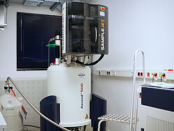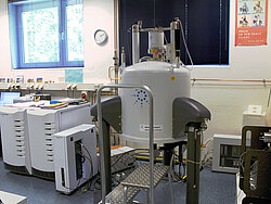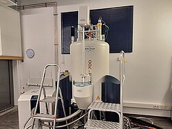 Das höchste Magnetfeld und das beste Signal-zu-Rausch-Verhältnis bietet unser Bruker Avance Neo 700 NMR-Spektrometer, das mit einer heliumgekühlten 5 mm TCI-Sonde ausgestattet ist. Aufgrund der hohen Empfindlichkeit ist es das wichtigste Gerät für die Strukturanalyse niedrig konzentrierter Verbindungen (im Bereich von 0,1 mM bis 2 mM). Zusätzlich verfügt das Gerät über eine zweite Sonde, eine 1,7 mm MicroCryoProbe, die die Möglichkeit zur Analyse noch niedriger konzentrierter Verbindungen erweitert, die für andere Arbeitsgruppen des Instituts von besonderem Interesse sind.
