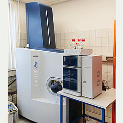 Das timsTOF Pro Massenspektrometer ist über eine Electrosprayionisationsquelle einer Agilent 1290 InfinityII HPLC mit Hochdurchsatzprobengeber nachgeschaltet.