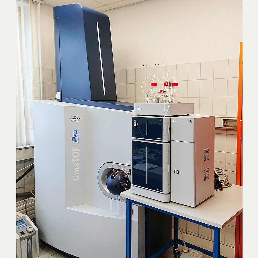 Das timsTOF Pro-Instrument der Firma Bruker ist ein hochauflösendes Massenspektrometer zur Durchführung von Hochdurchsatzanalysen mit höchster Massengenauigkeit. Als Besonderheit verfügt das timsTOF Pro über eine Trapped Ion Mobility Spektrometrie, die die Ionen aufgrund Ihrer Mobilität in einem Gasmedium trennt. In Kombination mit der chromatographischen Retentionszeit, der genauen Masse und der Fragmentspektren der Analyten, bietet die Ionenmobilitätspektrometrie einen zusätzlichen Parameter zur Trennung, Annotation und Unterscheidung von Analyten anhand ihrer Collisional Cross Section (gemessen in Å2 als Maß der “Größe und Form”). Die Ionenmobilitätspektrometrie ermöglicht auch die Unterscheidung isobarer Analyten basierend auf ihrer Stereochemie (z.B. cis-trans Isomerie). Ein Alleinstellungsmerkmal des timsTOFPro ist die Parallel Accumulation Serial Fragmentation (PASEF)-Technologie, bei der die Ionen vor der Ionenmobilitätstrennung akkumuliert werden, was in einer höchsten Ausbeute an detektierbaren Ionen resultiert, und somit in einer hohen Sensitivität.