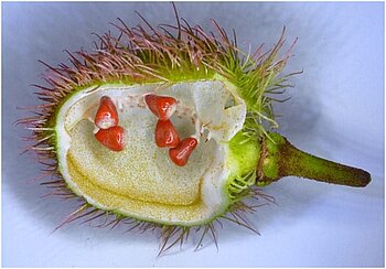 Außerdem arbeiten wir daran, in noch unvollständig aufgeklärten Biosynthesewegen die unbekannten Gene/Enzyme zu identifizieren. Ein Carotinoid-Derivat von Interesse ist Bixin, das industriell als natürlicher Lebensmittelfarbstoff eingesetzt wird. Bixin akkumuliert in den Samen des Baumes Bixa orellana (Abb. 5).