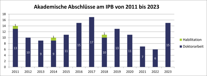 Von 2011 bis 2023 betreuten unsere Wissenschaftler/Innen insgesamt 146 Promotionen. Drei IPB-Wissenschaftler habilitierten seit 2011. Einige Gruppenleiter und Juniorforscher holten am IPB den nötigen Schwung für die nächste Karrierestufe. Sie sind heute Professoren an Universitäten und Hochschulen. Weitere Informationen zum IPB als Karrieresprungbrett finden Sie hier.