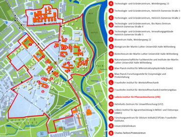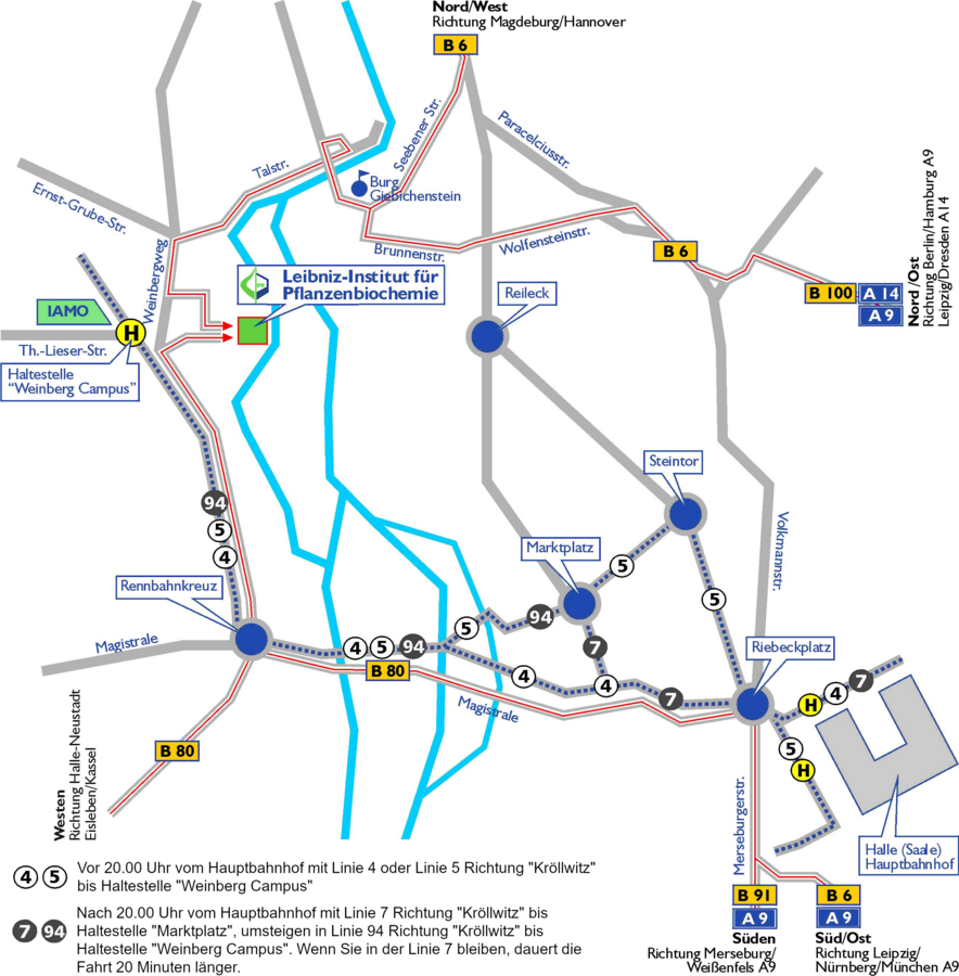 Vom Riebeckplatz aus fahren Sie auf die B 80 in Richtung Halle-Neustadt. Folgen Sie den Schildern "Universitätsklinikum Kröllwitz" auf den Gimritzer Damm. Am Ende des Gimritzer Damms (Ampel) folgen Sie der Route halbrechts in den Weinbergweg. Biegen Sie an der ersten Querstraße rechts in die Wolfgang-Langenbeck-Straße und anschließend an der ersten Kreuzung rechts in die Kurt-Mothes-Straße ein. Das Institut befindet sich linker Hand am Ende der Kurt-Mothes-Straße.
