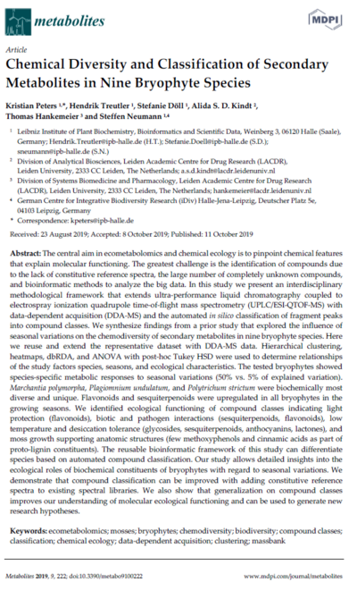 Peters, K.; Treutler, H.; Döll, S.; Kindt, A.S.D.; Hankemeier, T.; Neumann, S. Chemical Diversity and Classification of Secondary Metabolites in Nine Bryophyte Species. Metabolites 2019, 9, 222. DOI: 10.3390/metabo9100222