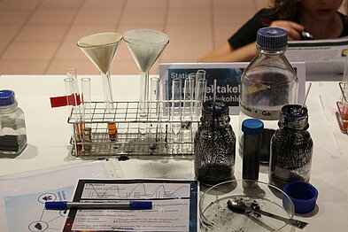 Viele pflanzliche Geruchs- und Aromastoffe kann man heutzutage synthetisch herstellen. Wir haben einen bunten Cocktail an verschiedenen Düften für Euch vorbereitet. Von Pilzen bis Veilchen ist Manches dabei. Könnt Ihr sie unterscheiden? Testet Eure Sinne und ratet fleißig mit! Unser olfaktorisches Quiz gilt immer als eine der schwersten Stationen in der Straße der Experimente. (Anja Knorrscheidt und Pascal Püllmann)